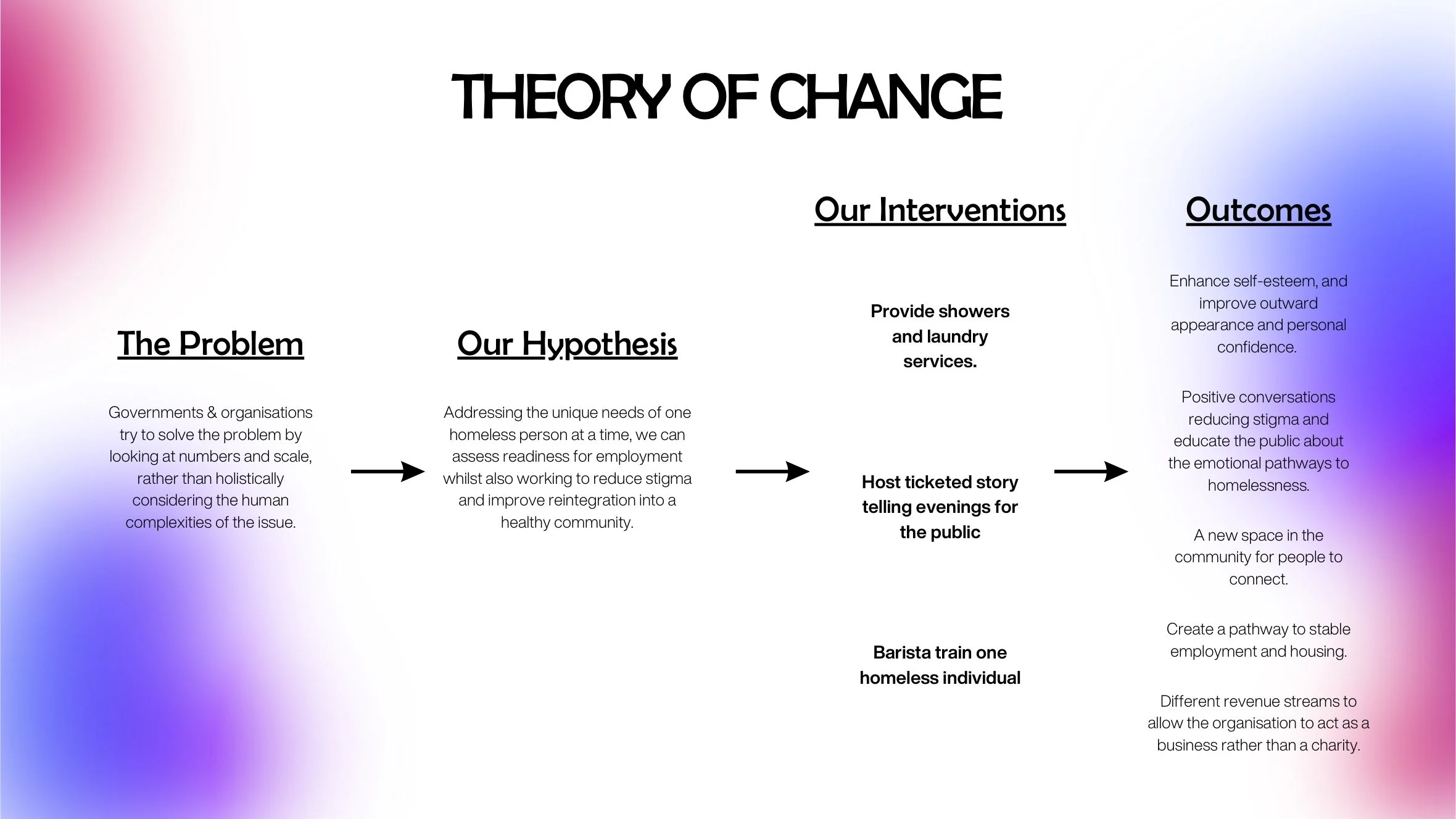 A hybrid charity & social enterprise coffee shop that provides entrepreneurial experience, laundry and shower facilities and community connection for homeless individuals.